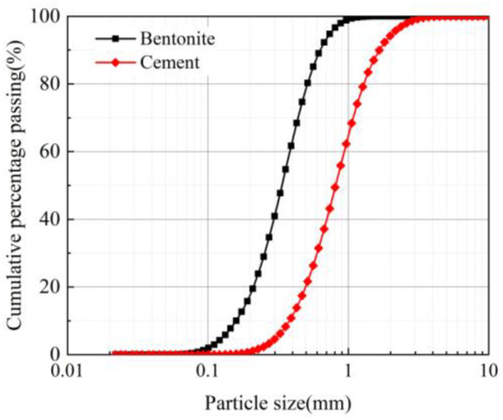 Bentonite is a sodium-based bentonite with montmorillonite as its main component, which is produced in Changsha, Hunan province. The 200-mesh sieve margin is less than 4% and the pulp-making rate is greater than 14 m3/t. The grain size of bentonite and cement is shown in Figure 1.