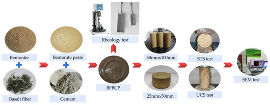 It is essential to ensure that fibers are dispersed into bundled monofilaments when preparing basalt fiber-reinforced bentonite cement paste (BFBCP) [29,30]. The specific mixing procedure is depicted in Figure 2. The initial step is to dry the mixture of fibers and bentonite for 3 min, then add the appropriate amount of water and stir for 5 min to obtain a bentonite base slurry. This step is the key to the dispersion of the fibers, because in the dry state, bentonite can promote the dispersion of the fibers as monofilaments. At the same time, the bentonite base slurry has high compatibility, which can facilitate the uniform distribution of fibers in the slurry. The second step is to add the cement to the bentonite base slurry and mix rapidly for 3 min to make basalt fiber-reinforced bentonite cement paste (BFBCP). The third step is to pour the basalt fiber-reinforced bentonite cement paste (BFBCP) slurry into the molds with walls of 50 mm × 100 mm and 25 mm × 50 mm and leave them to stand for 24 h before demolding. Finally, the basalt fiber-reinforced bentonite cement paste (BFBCP) specimens are cured in a maintenance box for 7 days to 28 days. Then, the relative humidity of standard curing is greater than 95%, and the temperature ranges between 20 and 30 °C.