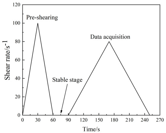 Rheological parameters are often used quantitatively for assessing microscopic effects within the slurry and are sensitive to perturbations in the mixture [31]. The soft solids rheometer (Brookfield RST-R/S) and a computer-programmed constant shear stress rheometer are used to obtain rheological parameters of the basalt fiber-reinforced bentonite cement paste (BFBCP). The test was equipped with a paddle rotor size of VT-60-30 (paddle diameter of 30 mm and height of 60 mm). Figure 3 showed that the rheological test consisted of a pre-shear phase, a stabilization phase, and a data acquisition phase. The first stage is the pre-shear stage, where the shear rate increases from 0 s−1 to 100 s−1 for the 30 s−1. The second is the stabilization stage where the shear stops in the 30 s. Finally, the third is the data collection stage, where the shear rate increases from 0 s−1 to 80 s−1 in the 80 s and decreases from 80 s−1 to 0 s−1 in the 80 s. Furthermore, each data point was collected in 4 s to obtain 38 data points. Only the rheological data are valid and range between 10% and 100% of the required torque.