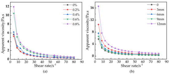 The relationship between shear rate and apparent viscosity: (a) fiber content, (b) fiber length.