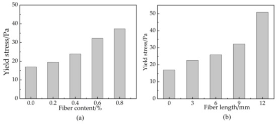 Effect of basalt fiber on the yield stress of BFBCP: (a) fiber content, (b) fiber length.