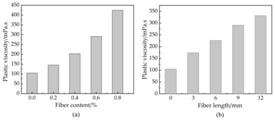 Effect of basalt fiber on plastic viscosity of BFBCP: (a) fiber content, (b) fiber length.