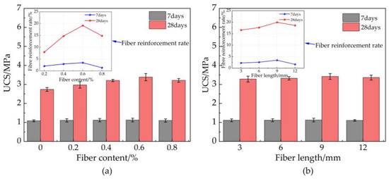 Effect of basalt fiber on UCS of BFBCP: (a) fiber content; (b) fiber length.