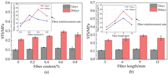 Effect of basalt fiber on STS of BFBCP: (a) fiber content; (b) fiber length.