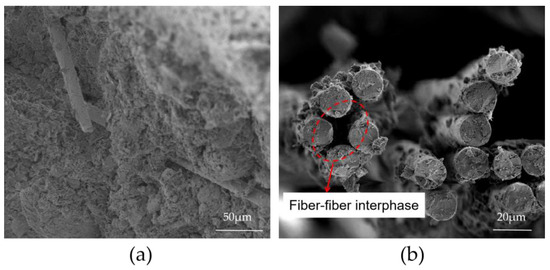 Uniform fiber distribution is a prerequisite for good mechanical properties in cementitious composites. Figure 12 shows the microstructure of 0.6 basalt fibers (BF) in 9 bentonite cement paste (BCP) specimens and 0.6 basalt fibers (BF) in 12 bentonite cement paste (BCP) specimens. Most fibers are monofilaments and distributed uniformly (Figure 12a), whereas others are distributed in fiber clusters (Figure 12b).