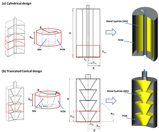 Two kinds of MH-PCM tanks integrated with a stack of compacted disks: (a) cylindrical MH bed and (b) truncated conical MH bed.