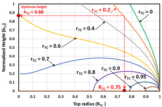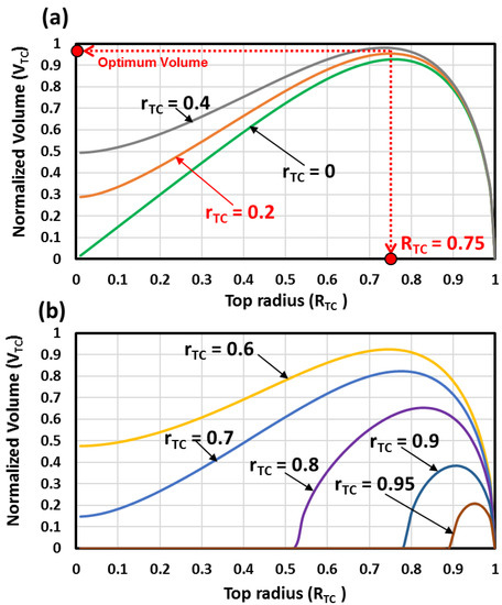 The bottom radius () was kept to constant values (0, 0.2, 0.4, 0.6, 0.8, 0.9 and 0.95), and the top radius () varied from 0 to 1. The obtained curves of the MH bed volume are depicted in Figure 3. When the bottom radius was kept at zero (), and the top radius () varied from 0 to 1, the shape of the MH bed was a cone. The obtained curve of the MH bed volume is depicted in Figure 3.