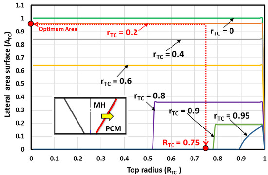 However, our objective is to reach the maximum heat exchange surface area with the PCM domain. When the truncated cone MH disks are stacked, the heat exchange surface area with PCM is increased (sides + top-bottom) and reaches a maximum (). The maximum surface area is reached when the bottom radius (i.e., when the shape is a cone). Hence, the heat exchange surface area has limits where it is greater than that of Case 1 () and lower than the maximum surface area ().