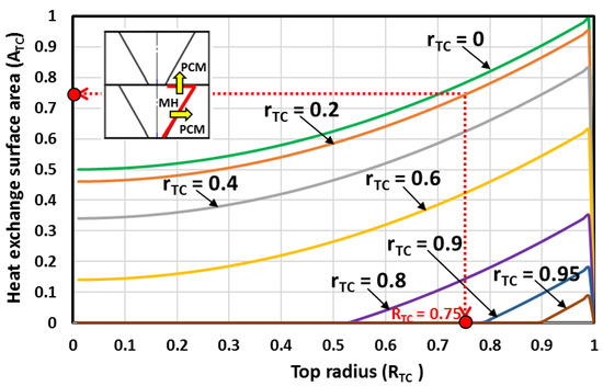 The heat exchange surface area between two MH-PCM stacked disks is depicted in Figure 6 for different top and bottom radii. Under the defined design constraints, the higher surface area is reached when the MH bed shape is a cone (). However, in real situations, a hydrogen filter tube (with a radius ) is inserted in the center of the MH bed. Therefore, the MH bed cone shape is dropped, and only the truncated conical shapes are retained. It is observed that the larger heat exchange surface area between two MH-PCM stacked disks is reached when the bottom radius is and when the top radius is .