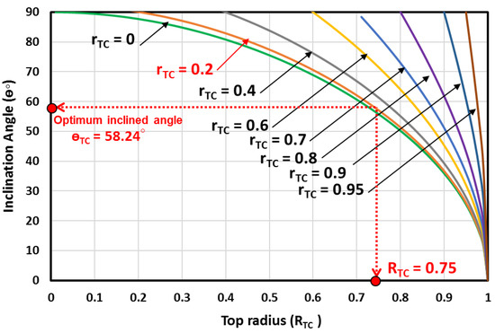 The inclination angle of the truncated cone shapes is calculated for different top and bottom radii. Figure 7 depicts the evolution of the inclination angle () against the top radius () and the bottom radius (). It is seen that, for all the cases where the top radius is equal to the bottom radius, the shape of the MH bed is a cylinder, and the inclined angle is as shown in Figure 7. The figure is used to determine the optimum inclination angle, which is , which corresponds to a bottom radius of and a top radius of .