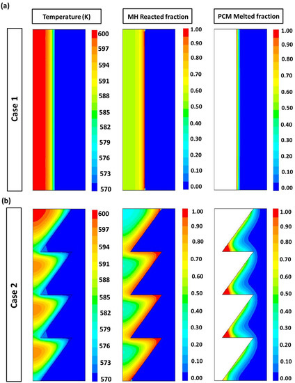 This is because the thermal resistance of MH is smaller than that of PCM, and there is no obvious temperature gradient in the MH bed; thus, the melted fraction and the reacted fraction are more uniform in Case 1. However, in the truncated configuration (Case 2), PCM begins to melt faster from the inter-wall to the external wall, storing heat in the MH bed.