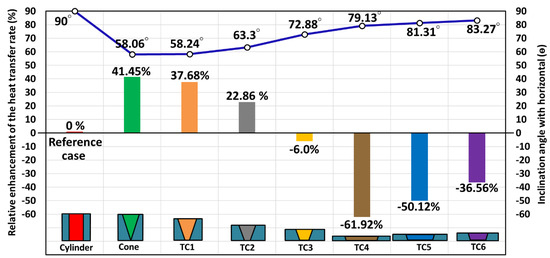 The relative enhancement of the heat transfer rate in the few truncated conical MH disks (Case 2) is compared to the basic cylindrical Case 1 (i.e., different geometric parameters are tested according to Table 3) and is depicted in Figure 9.