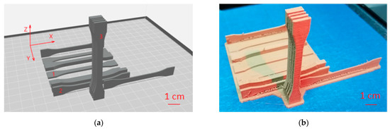 Specimens on the virtual build platform of the fifth-generation MakerBot Replicator. (a) Arrangement of models in the MakerBot software printed along: 1—the X axis; 2—the Y axis; and 3—the Z axis; (b) a series of 3D-printed specimens.