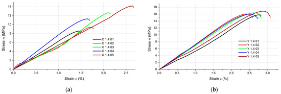 Stress–strain curves for the 1.4 mm thick specimens composed of PLA + bronze printed in (a) the X orientation and (b) the Y orientation.