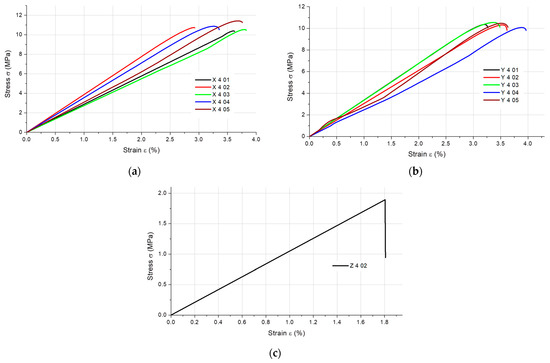 Stress–strain curves for the 4 mm thick specimens composed of PLA + bronze printed in (a) the X orientation, (b) the Y orientation and (c) the Z orientation (only one specimen tested).