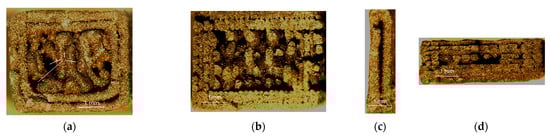 Cross-sections of the PLA + bronze specimens after fracture observed by means of a stereoscopic microscope, magnification ×12; (a) specimen 4.0 2Z, with visible black areas indicating lack of filament (1); (b) specimen 4.0 5Y; (c) specimen 1.0 2Z; (d) specimen 1.8 5X.