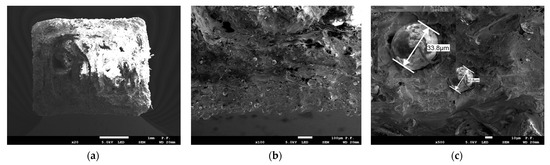 Cross-section of specimen 4.0 2Y composed of PLA + bronze after fracture observed with a scanning electron microscope; (a) observation direction—perpendicular to the cross-section; magnification ×25; (b) observation direction—at an angle of 45° to the cross-section; magnification ×25; (c) observation direction—at an angle of 45° to the cross-section; magnification ×100.