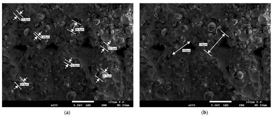 Figure 10 and Figure 11 show the cross-sections of the reference 4 mm thick specimens. The sizes of the bronze powder grains and gaps between the filament layers were measured, as illustrated in Figure 11a,b, respectively. The gaps between the powder grains and PLA visible in Figure 11c indicated that there was no adhesive bonding between them. The grain size of the bronze powder ranged from 8.29 µm to 48.8 µm (Figure 11a). The gaps between the filament layers were different, for instance, 100 µm and 118 µm (Figure 11b). Thus, it could be concluded that the poor tensile strength of the specimens tested was a result of the poor adhesion of the powder reinforcement to the base material, the high fibre volume ratio, i.e., the high percentage of bronze volume in the entire volume of the PLA-based composite material, and the occurrence of numerous gaps between the filament layers.