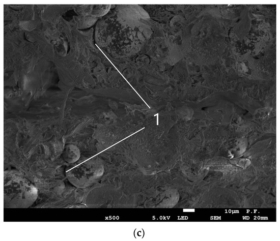 Cross-section of specimen 4.0 2Z composed of PLA + bronze after fracture observed with a scanning electron microscope. Observation direction—perpendicular to the cross-section; (a) magnification ×25; (b) magnification ×100; (c) magnification ×500.
