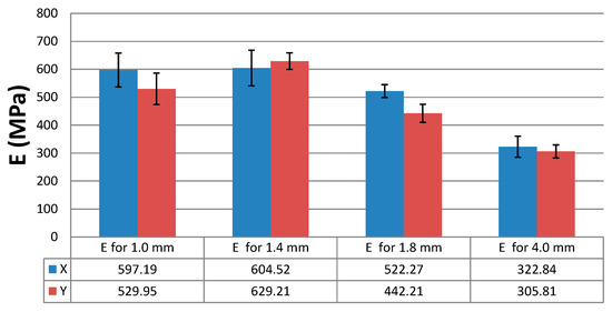 Based on the tests carried out for the PLA + bronze material and the results presented in Figure 14, we conclude that the modulus of elasticity, E, was reported to be dependent on the printing direction and the specimen’s thickness. The differences reached several percent (up to 18%). Interestingly, the values were lower for the thickest PLA + bronze specimens, i.e., those 4 mm in thickness, than for the thin-walled models, as shown in Figure 14. Generally, the modulus of elasticity was lower for the specimens printed in the Y orientation than for those fabricated in the X orientation (Figure 14), which was mainly due to the arrangement of the filaments. In the case of specimens with a thickness of 1.4 mm, the modulus of elasticity was slightly higher in the Y direction than in the X orientation.