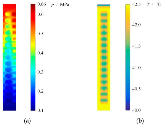 Pressure and temperature distributions of sealing film. (ω = 1000 rpm, po = 0.6 MPa, pi = 0.1 MPa). (a) Pressure distribution, (b) Temperature distribution.