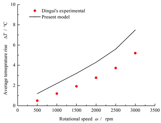 The pressure and temperature distributions obtained by present model are shown in Figure 3. Obviously, under aqueous lubrication condition, the multi-circle-dimpled face present hydrodynamic effect and film temperature rise. Here, when the rotational speed ω = 1000 rpm, sealing pressure po = 0.6 MPa and ambient pressure pi = 0.1 MPa, the maximum pressure of 0.66 MPa as well as the maximum temperature rise of 2.5 °C is produced. With the increase of rotational speed, the film temperature increases accordingly. The average film temperature rise calculated by the present model is compared with the Dingui’s experimental, as shown in Figure 4. It can be seen that the average film temperature rise increases from about 1.2 °C to 7.5 °C with increasing rotational speed from 500 rpm to 3000 rpm. The temperature rise obtained by the current model is always little higher than the literature experimental at different speed. Meanwhile, the error of temperature rise between the literature and the current model keeps stable, about 30~40%. The more important is that the current model gives the same trend of temperature change as mentioned in the literature.