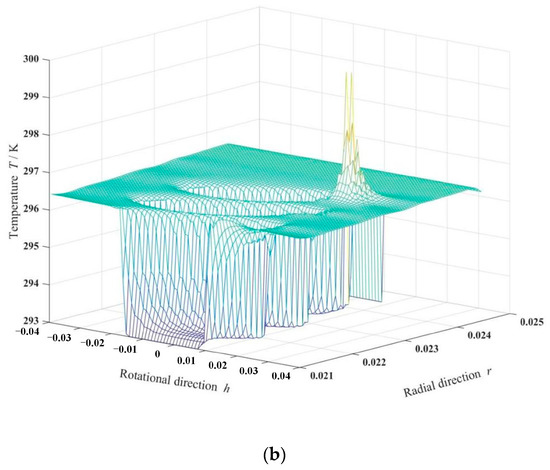 Cross-sectional temperature fields of seal and temperature isogram of sealing film. (ω = 20,000 rpm, Po = 4, h0 = 2 μm, hd = 5 μm, b = 0.20 mm, γ = 3, α = 45°, N = 80). (a) Cross-sectional temperature fields of seal, (b) Temperature isogram of sealing film.