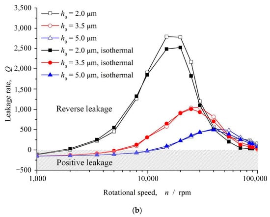 The leakage of sealing fluid from the high-pressure side to the low-pressure side is defined as positive leakage, and vice versa. As can be seen from Figure 6a,b, under the shear rate, the ellipse dimples generate upstream pumping to the high-pressure side, and forms a circumferential high pressure isoline of 1.0 Mpa under both thermohydrodynamic and isothermohydrodynamic conditions, higher than the outer sealing pressure of 0.4 Mpa in the high-pressure area, indicating that the ellipse-dimple face can achieve complete reverse leakage. As shown in Figure 6c, the leakage rate presents a positive value.