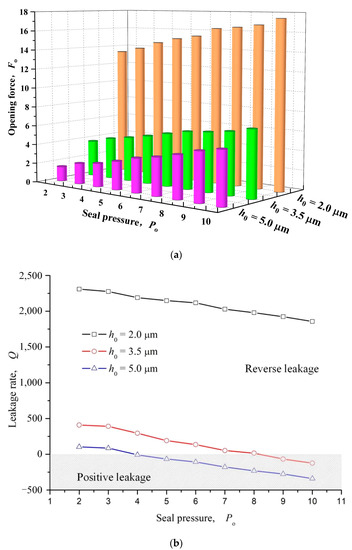 Influence of seal pressure on opening force and leakage rate (ω = 12,000 rpm, h0 = 2 μm, hd = 5 μm, γ = 3, α = 40°, N = 80). (a) Opening force; (b) Leakage rate.