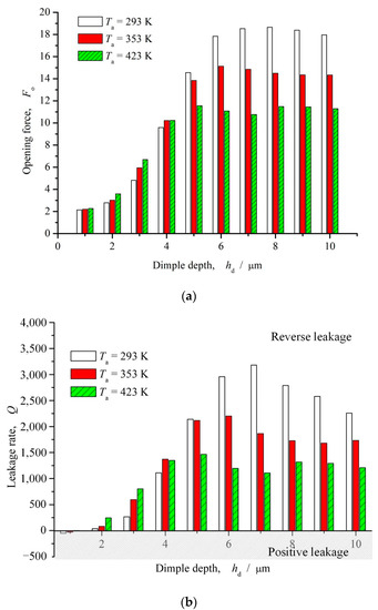 Influence of dimple depth on opening force and leakage rate (ω = 12,000 rpm, Po = 4, h0 = 2 μm, γ = 3, α = 45°, N = 80). (a) Opening force; (b) Leakage rate.