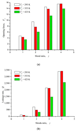 Influence of seal temperature on opening force and leakage rate (ω = 12,000 rpm, Po = 4, h0 = 2 μm, hd = 5 μm, γ = 3, α = 45°, N = 80). (a) Opening force; (b) Leakage rate.