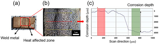 Corrosion depth examination process using a 3D profiler. (a) The corroded weldment after the galvanostatic test, (b) magnified image of the red square in (a), and (c) corrosion depth measurement.