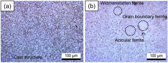 Optical micrographs of the weldment: (a) weld metal; (b) heat-affected zone.