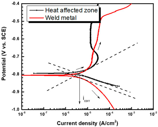 where βa represents the anodic Tafel slope, βc represents the cathodic Tafel slope, i0 represents the exchange current density, α represents the charge transfer coefficient, n represents the charge number, R represents the gas constant (8.314 J/(mol∙K)), and T represents the absolute temperature (K). From Equation (3), a linear relationship was derived, and the corrosion current density of the HAZ was measured at 4.304 μA/cm2, and the corrosion current density of the weld metal was measured at 2.569 μA/cm2 according to the polarization curves as shown in Figure 4 and Table 3. As a result, the HAZ is more prone to corrosion than the weld metal [26,27].