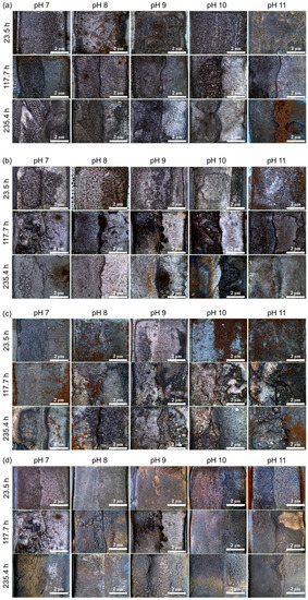 Photographs of weldment after the corrosion acceleration. DO: (a) 0, (b) 200, (c) 1000, and (d) 8000 ppb.