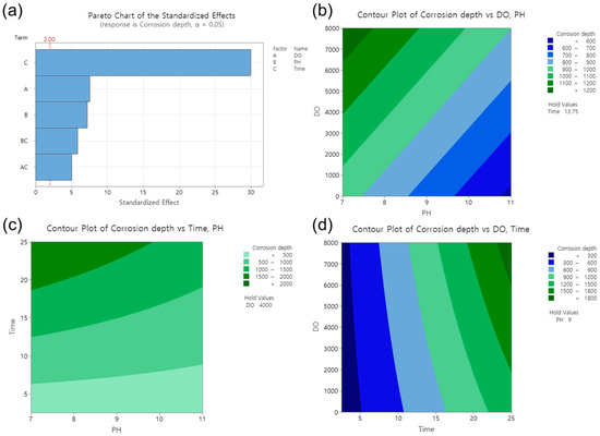 Effect of factors in response surface analysis. (a) Pareto chart of the standardized effects, contour plots of corrosion depth vs. (b) DO and pH, (c) operating time and pH, (d) DO and operating time.