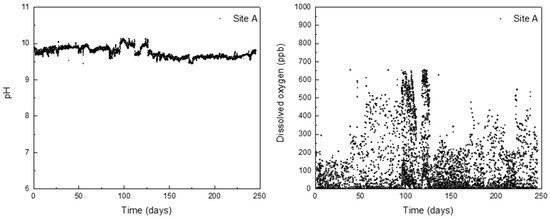 Using the derived formula, the corrosion depth of the HAZ can be predicted based on the levels of corrosion factors. Since DH pipelines are buried in soil, it can be difficult to directly manage their corrosion. Therefore, the corrosion factors in DH water were monitored to indirectly predict the corrosion depth of the HAZ. The pH and DO levels in the DH water were measured every 30 min over a period of 250 days under operating conditions, and the results are presented in Figure 7. The pH was observed to remain stable between 9 and 10, which is within the management standard for DH water. However, the DO concentration exceeded the management standards of 200 ppb several times. Based on these results, the average values of corrosion factors were applied to the formula, and Table 7 displays the predicted depth of corrosion in the DH pipeline HAZ over time. This method is expected to provide an indirect means of examining the corrosion depth of the DH pipeline steel weldment.
