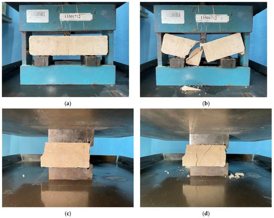 Testing specimens for bending strength (a,b) and compressive strength (c,d) before collapse and after collapse, respectively.