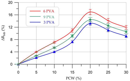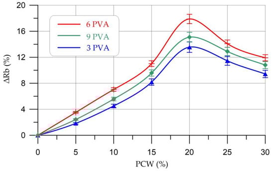 Change in bending strength (∆Rbtb) of geopolymer composites depending on the content of PCW and PVA.