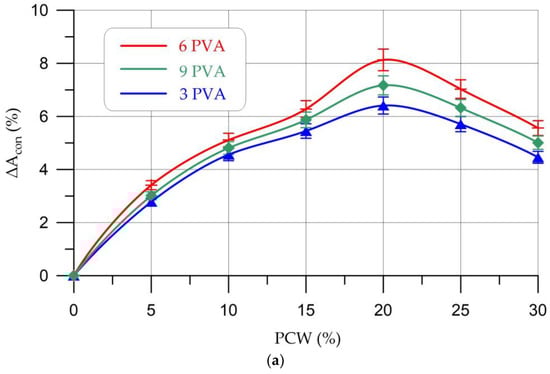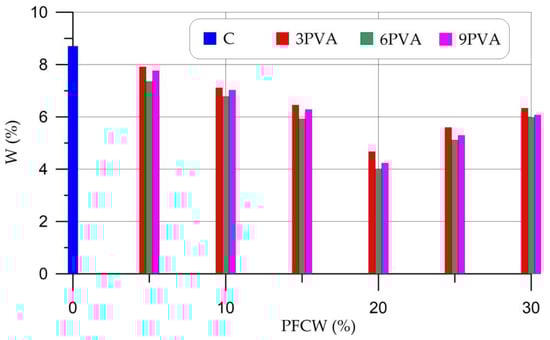 Figure 9 shows that samples with a PVA content of 6% and PCW of 20% have the lowest water absorption, up to 54% less than that of the control composition. The general nature of the change in water absorption can be described as follows: a decrease in water absorption with the replacement of a part of metakaolin with 5–20% PCW and, conversely, an increase in water absorption with the replacement of a part of metakaolin with 25–30% PCW. At any percentage of PCW replacement, formulations containing 6% PVA additive show the best values. With a PVA content of 6%, geopolymers have the best thixotropy. This means that all compositions with a given dosage of PVA will have less porosity and less water absorption, regardless of the considered dosages of PCW. The decrease in water absorption of modified PCW and PVA compositions from geopolymer concrete is explained by better cohesion of the structure, which contributes to an increase in strength by reducing defects and creating barriers to the formation and development of cracks and voids in the composite [,]. The presence of high adhesion between the newly formed phases and unreacted particles of the aluminosilicate component ensured high strength and low water absorption of the hardened geopolymer composite [].