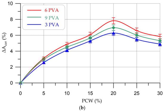 The nature of the change in bending strength is similar to the change in compressive strength, i.e., an increase in bending strength is observed at a PCW content of 5–20% and a decrease, starting from 25% PCW. The maximum increase in bending strength was also recorded at a PCW content of 20% and PVA of 6% and amounted to 16.93%. The increase in strength is due to the good dispersion of PCW in the geopolymer composite, and thus the creation of barriers against crack growth []. At the same time, the addition of PVA also contributes to a more compact and homogeneous structure of the composite with a reduced number of voids compared to the control composition of the geopolymer []. When the content of PCW is more than 20%, a decrease in strength characteristics is observed, which is explained by a violation of the connectivity of the structure of the geopolymer composite and the formation of a larger number of pores and microcracks. Additionally, when the content of PCW is more than 20%, the content of unreacted particles increases due to a decrease in the proportion of the main binder component [,].