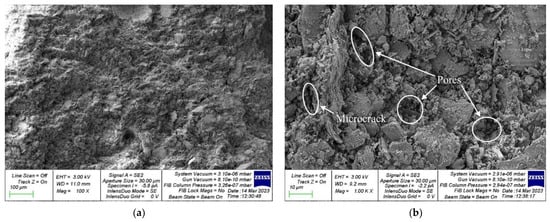 As can be seen, geopolymer concrete composition type 4A/6 (Figure 12) has the densest structure with fewer pores and microcracks compared to the control composition of geopolymer concrete (Figure 11). This is because PCW particles, brought to the state of a finely dispersed powder, play the role of a micromodifier, which contributes to the creation of additional crystallization centers, as a result of which structure formation is improved, and a denser packing of particles occurs. Thus, the composition 4A/6 has a denser structure and a more perfect homogenization process and, thus, all this contributes to a better technology for hardening such geopolymer concrete, improved physical and chemical processes of structure formation occur and, at the same time, mechanical properties that are directly dependent on structures also increase. Thus, the use of PCW performs not only an ecological role but also contributes to the improvement of quality and the creation of highly functional geopolymer concretes. The addition of PVA to the geopolymer mixture helps to reduce the number of pores and microcracks, which in turn leads to an increase in bending strength and a decrease in water absorption. In an alkaline environment in which the geopolymerization reaction occurs, PVA hydrolyzes to a mixed polymer containing both hydroxyl and acetyl groups. Due to the good water solubility of PVA, no isolated areas of its concentration are observed in the microstructure of the geopolymer composite, and it is evenly distributed in the mixture. Additionally, the addition of PVA in an amount of 6% by weight of the binder leads to an improvement in the thixotropy of the composition and an increase in adhesion [,,,].