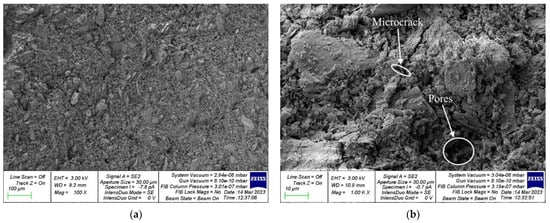 A sample of geopolymer concrete of the control composition: (a) 100×; (b) 1000×.