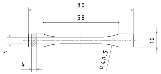 The shape and dimensions (in mm) of the samples seen in Figure 1 for the tensile test were determined based on the standard EN ISO 527-2:2012, Plastics—Determination of tensile properties—Part 2: Test conditions for molded plastics [31]. Although this standard is not intended for 3D printed plastics, given that it is most often used in the literature together with the ASTM D638 Type-I standard, it was used in this experiment [32,33].