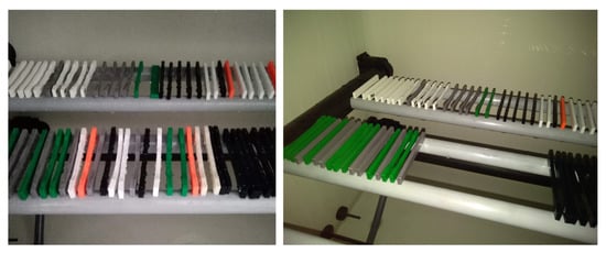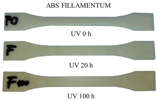 After 20 h, color changes could be observed on the ABS samples (for lighter shades), showing a slight yellowing, and the surface of the PLA samples became sticky. No visual changes were observed in the PETG and ASA samples. The second set was illuminated for 100 h; after this time, the color changes were more noticeable in the ABS material samples, e.g., Fillamentum ABS (see Figure 6), and were also slightly evident in the ASA material samples.