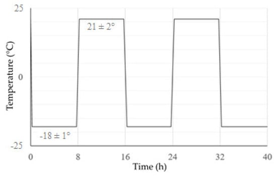 Temperature cycling took place by alternating exposure to frost at −18 °C (±1 °C) and room temperature at 21 °C (±2 °C). The samples were subjected to a total of 130 such cycles, with the duration of one cycle being 16 h. The course of the temperature cycle is shown in Figure 5.
