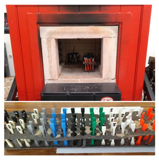 Another set of samples was placed in the furnace for 100 h at a temperature of 60 °C (see Figure 7). This temperature was chosen because there would be no significant shape deformation of the samples and thus it would be possible to test their mechanical properties. At the same time, this is the glass transition temperature range for PLA material. For the remaining materials, this is the temperature below the glass transition temperature.