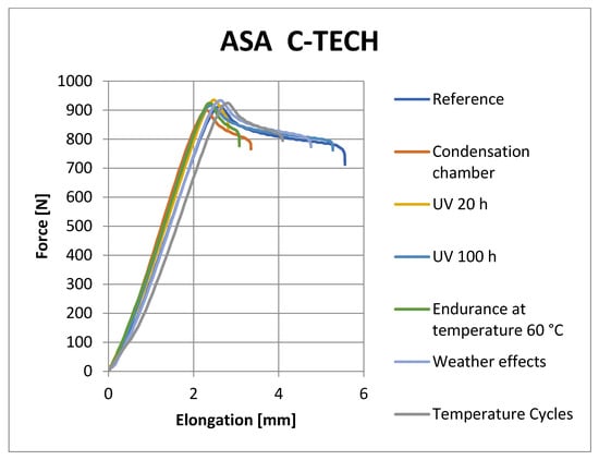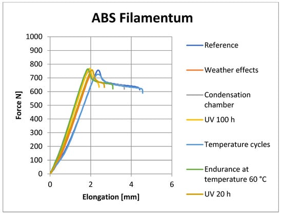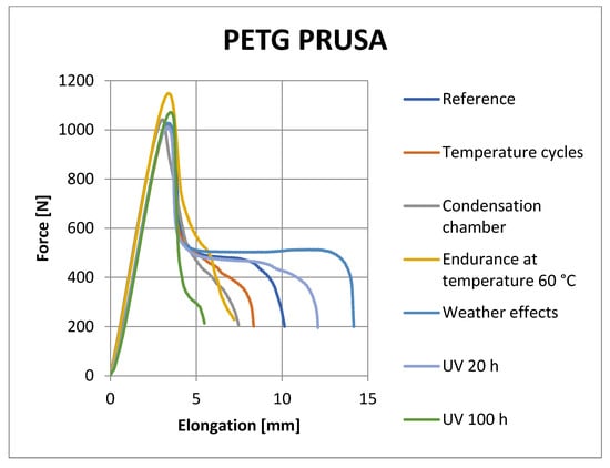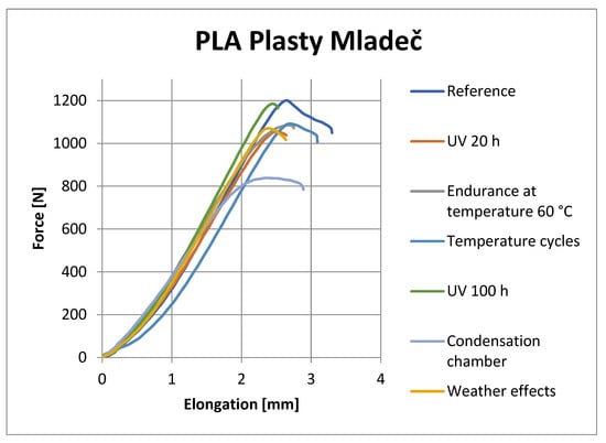 Figure 8, Figure 9, Figure 10 and Figure 11 show representative graphs of selected representatives of individual types of materials, where the curves during the tensile test are shown. These curves show the changes caused by individual degradation effects. In Section 6, the achieved results are described in more detail, based on the results of the statistical analysis, where individual types of material are compared with each other. Tensile diagrams of the remaining materials are in the Supplementary Materials.