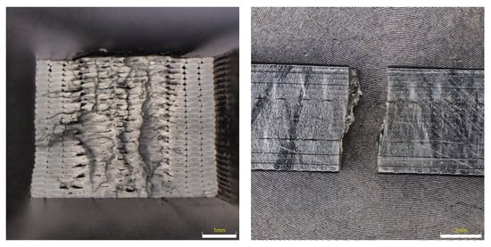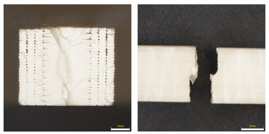 The fracture surfaces of the PLA material, which should be most susceptible to changes in properties after being placed in a degrading environment, are shown in Figure 14. From the shape of the fractures, it is clear that in the reference sample the fracture goes in the direction of the printing of the fibers and has a fractured cleavage shape. After exposure to the degradation effect, the fracture changes to planes, where the fracture goes across the surface of the specimen and is brittle with a minimal proportion of ductile fracture. When observing the fracture surfaces, it is evident how many large imperfections and gaps were created when printing the perimeters of samples. Compared to the ABS sample, the number of these imperfections is higher.