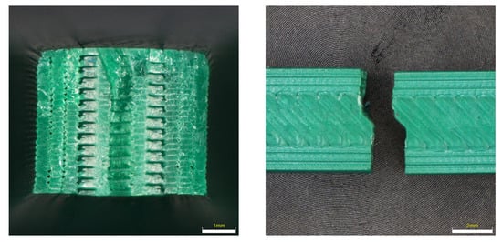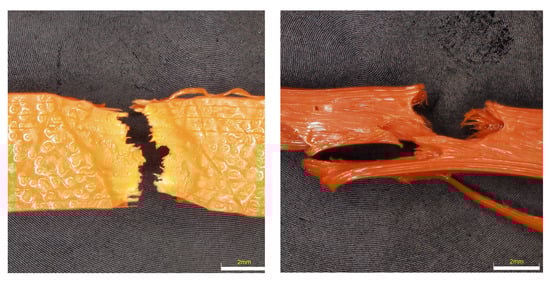 From the nature of the fracture in the PETG material (see Figure 13), it is evident that this is the most flexible material of all. Not all PETG specimens ruptured, but the tensile test was set up so that the test was terminated when the Fmax dropped by more than 80%. At the same time, due to the shape of the fracture, the details of the fracture surfaces were not taken, because the fracture surfaces are very fragmented and the depth of field of the optical microscopes did not allow taking high-quality images. It is evident from the results that UV radiation had the highest effect when the color lightened and the sample was completely broken. In the remaining samples, it is possible to observe a very large elastic-plastic deformation, which is most pronounced in the sample after placement in the condensation chamber.